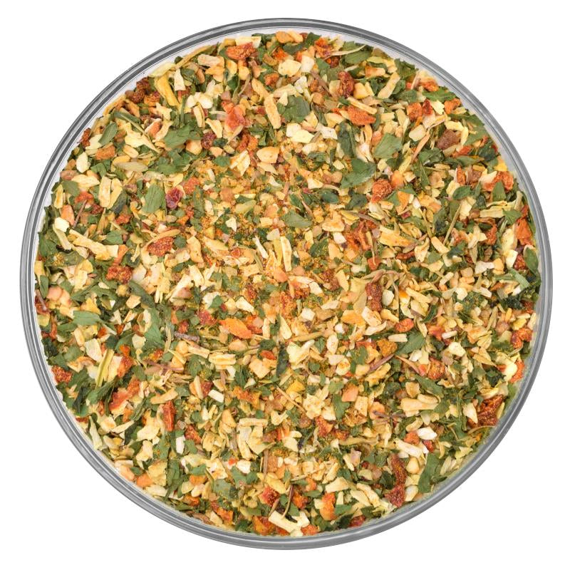 Fleur de Sel (Salz), Rauchsalz (Salz, Rauch), Bio Zwiebel, Bio Tomaten, Bio Knoblauch, Bio Petersilie, Bio Muskatnuss, Bio Piment, Bio Kurkuma, Bio Koriander, Bio Pfeffer schwarz, Bio Thymian